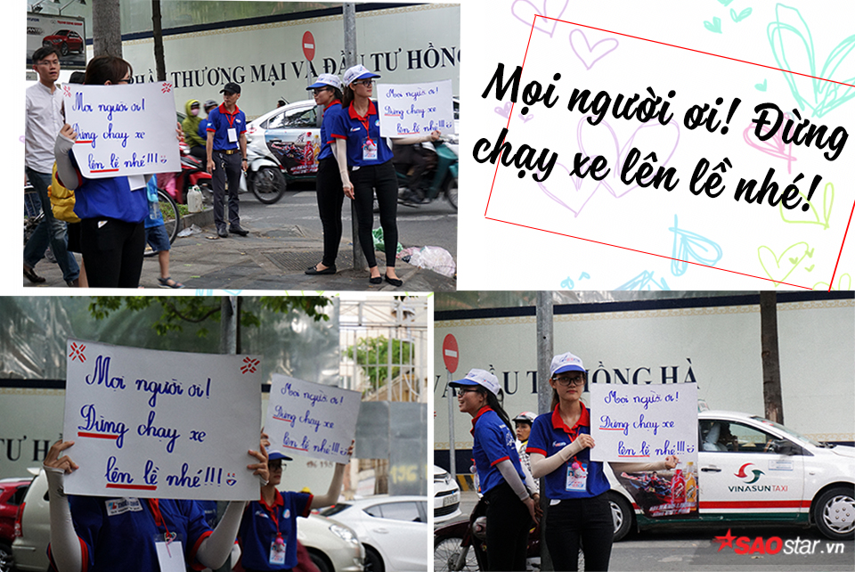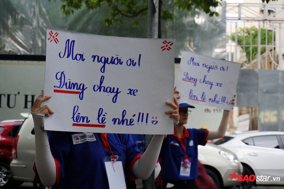 Cũng trong chiều nay, tại điểm thi trường THPT Marie Curie (Nam Kỳ Khởi Nghĩa, Q.3), các bạn tình nguyện viên cũng hỗ trợ nhiệt tình về giao thông. Bên cạnh nhóm tình nguyện viên hỗ trợ công tác thi cử, một nhóm bạn khác cũng đã đứng tại các góc đường, trên tay là bảng hiệu “Mọi người đừng chạy xe lên lề nhé!” viết bằng tay cùng những kí hiệu trang trí.