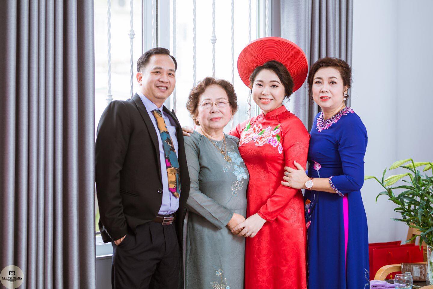Cô dâu rạng rỡ bên gia đình trong ngày vui