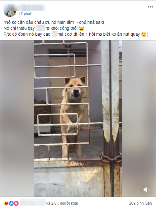 Tài khoản J.H viết: “Nó không cắn đâu cháu ơi, nó hiền lắm”, chủ nhà nói. Nhìn xem, nó chỉ thiếu bay ra khỏi cổng thôi. Có đoạn nó bay cao nhưng mình dơ điện thoại lên một hồi mới biết chưa ấn quay”.