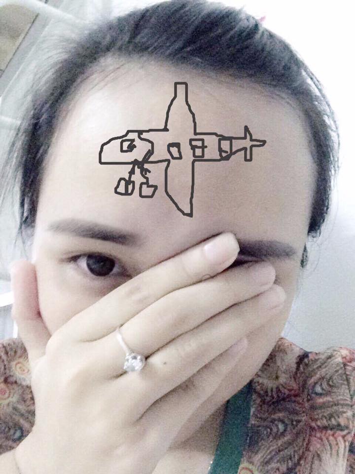 Vẽ hẳn máy bay lên trán để chứng minh trán sân bay là có thật.