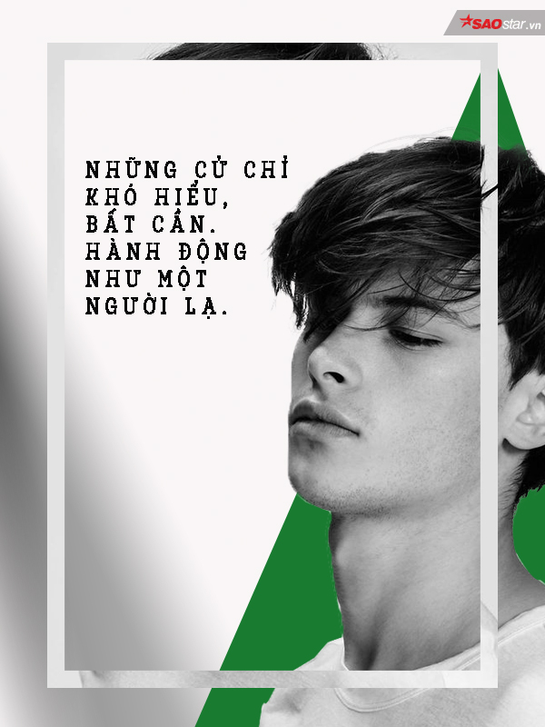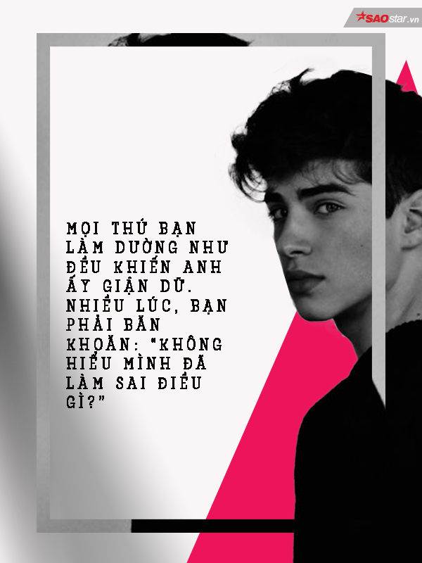 Mọi thứ bạn làm dường như đều khiến anh ấy giận dữ. Nhiều lúc, bạn phải băn khoăn: “Không hiểu mình đã làm sai điều gì?”. Lý do đơn giản là bạn đi dự tiệc ở công ty hoặc đi làm về muộn. Anh ấy không cho bạn cơ hội giải thích; thậm chí, bạn có kể về buổi tiệc vui vẻ thì anh ấy cũng phản ứng bằng việc la hét lung tung.