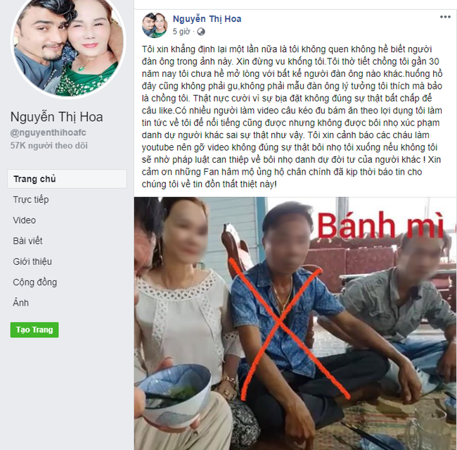 Cô Hoa bức xúc: “Tôi xin khẳng định lại một lần nữa là tôi không quen không hề biết người đàn ông trong ảnh này. Xin đừng vu khống tôi. Tôi thờ tiết chồng tôi gần 30 năm nay tôi chưa hề mở lòng với bất kể người đàn ông nào khác… Thật nực cười vì sự bịa đặt không đúng sự thật bất chấp để câu like. Có nhiều người làm video câu kéo đu bám ăn theo lợi dụng tôi làm tin tức về tôi để nổi tiếng cũng được nhưng không được bôi nhọ xúc phạm danh dự người khác sai sự thật như vậy.