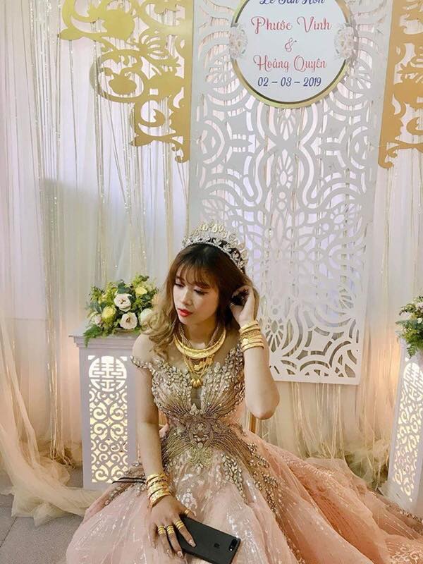Chưa hết, còn loạt vòng kiềng với dây chuyền vàng cũng được cô dâu này treo đầy cổ. Được biết, đây là đám cưới của cô dâu Hoàng Quyên và chú rể Phước Vinh diễn ra vào ngày 2/3/2019 vừa qua.