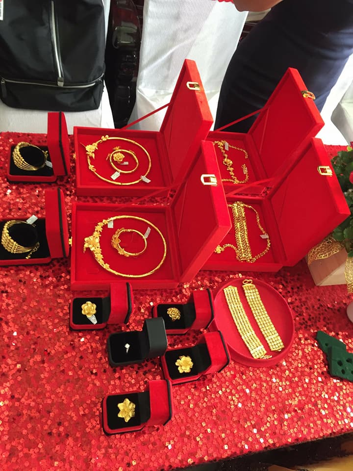 Theo đó, trong hôn lễ, rất nhiều hộp vàng được trưng bày trước mặt cô dâu. Trước sự chứng kiến của mọi người, chú rể lần lượt đeo từng món trang sức gồm vòng cổ, vòng tay, nhẫn, bông tai… cho vợ mình. Ước chừng số vàng này phải lên 1kg khiến nhiều người ngỡ ngàng.