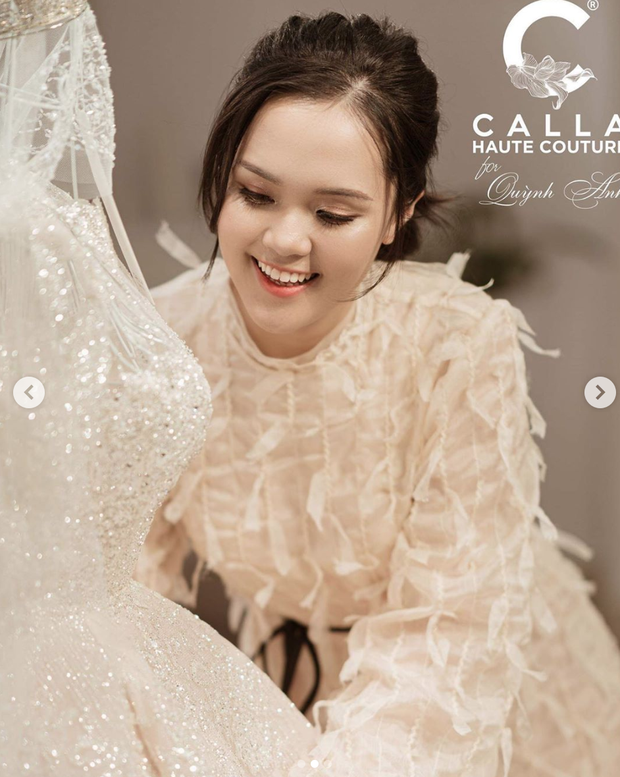 Trước đó vài giờ, cô dâu Quỳnh Anh vừa chính thức khoe bộ váy cưới mà cô nàng sẽ diện trong ngày vu quy về nhà chồng. Vợ Duy Mạnh tỏ ra rất yêu thích và hạnh phúc khi nhận được chiếc váy cưới vừa vặn, ưng ý. Trên trang cá nhân, cô chia sẻ: “Ngày em được nhận chiếc váy trong mơ… chiếc váy đẹp nhất, có ý nghĩa nhất cuộc đời mình. Trông mặt chú rể thì khá là tâm đắc và mong chờ ngày được sánh bước cùng vợ lắm đây này”.