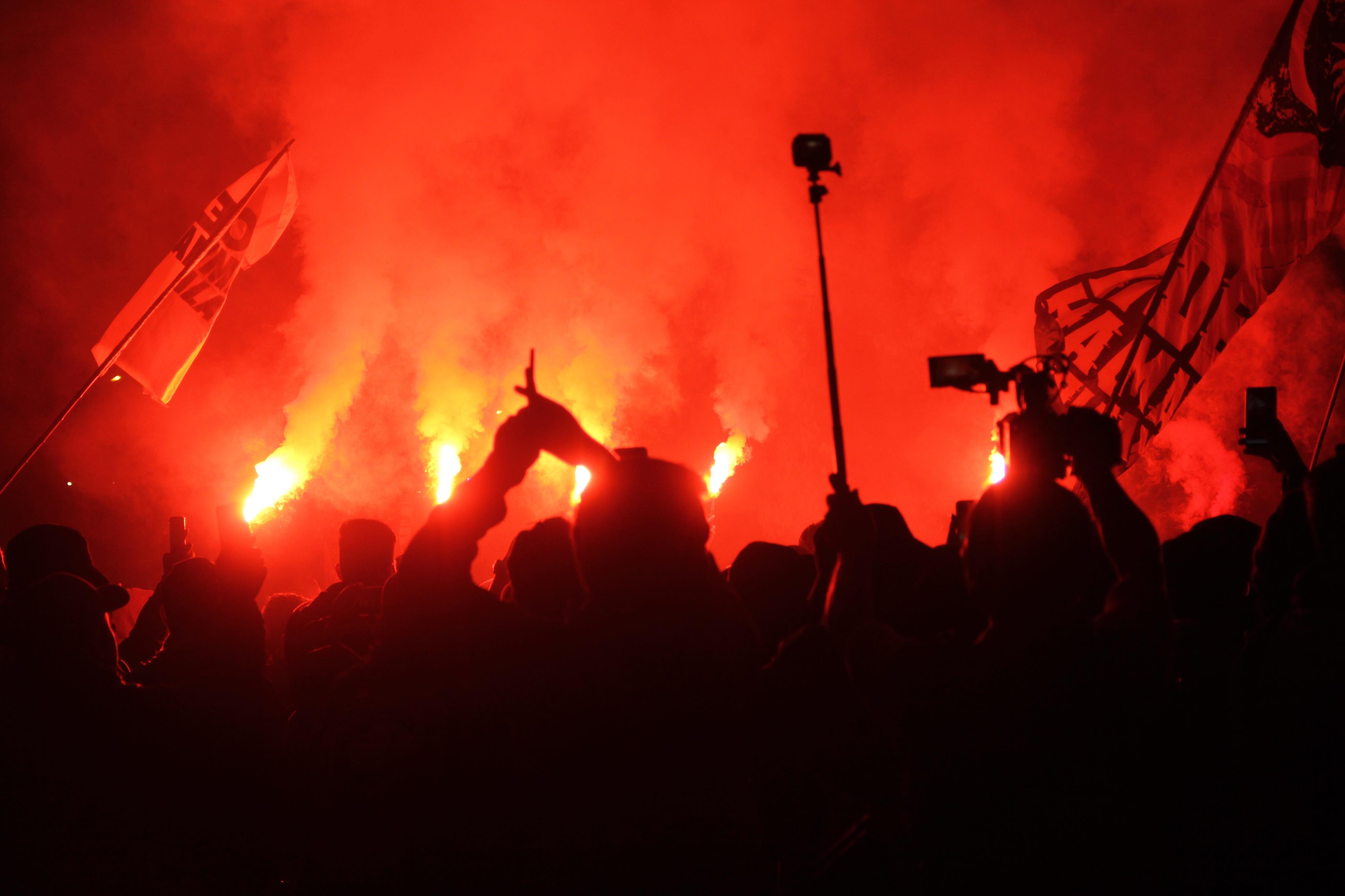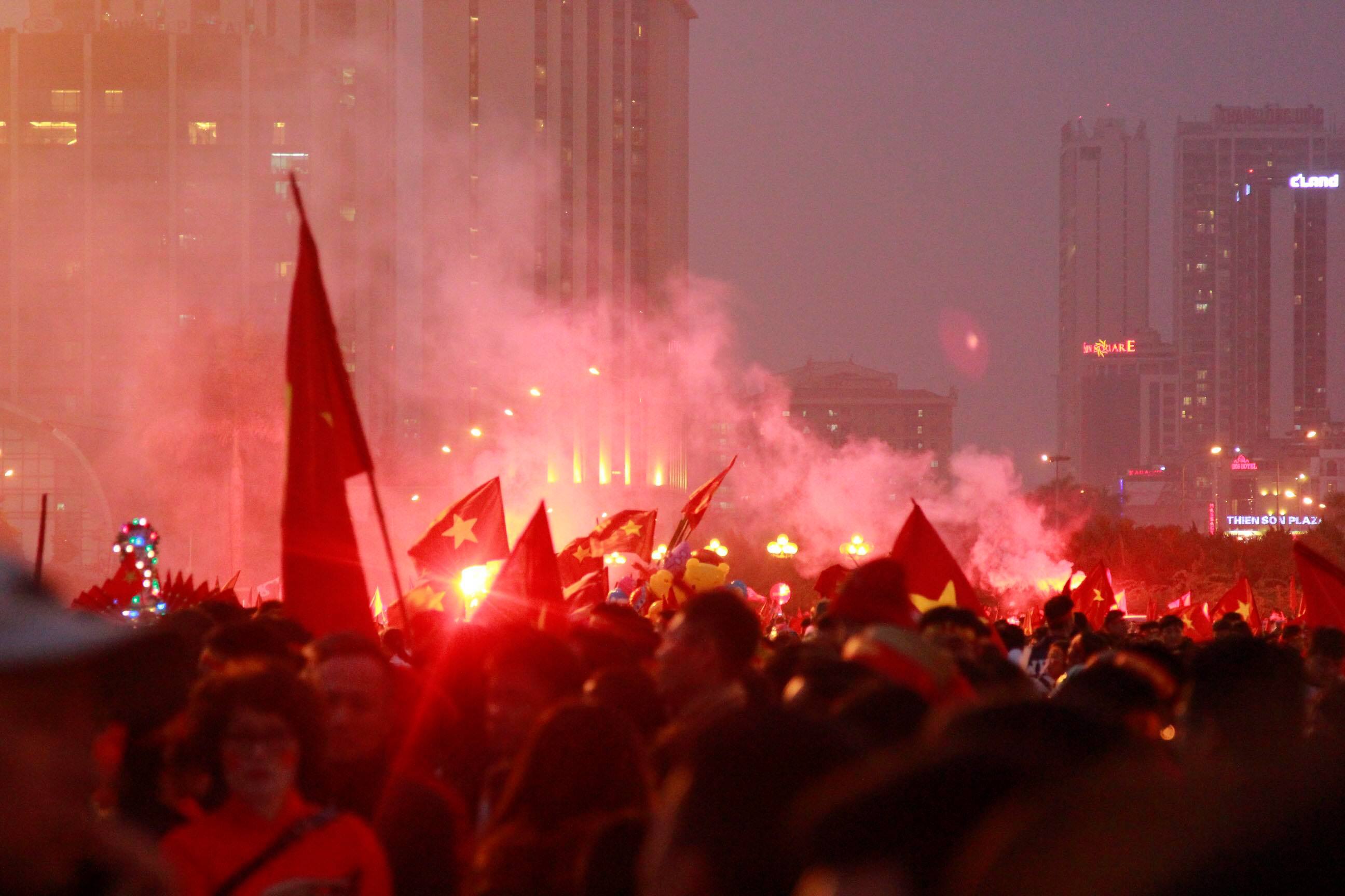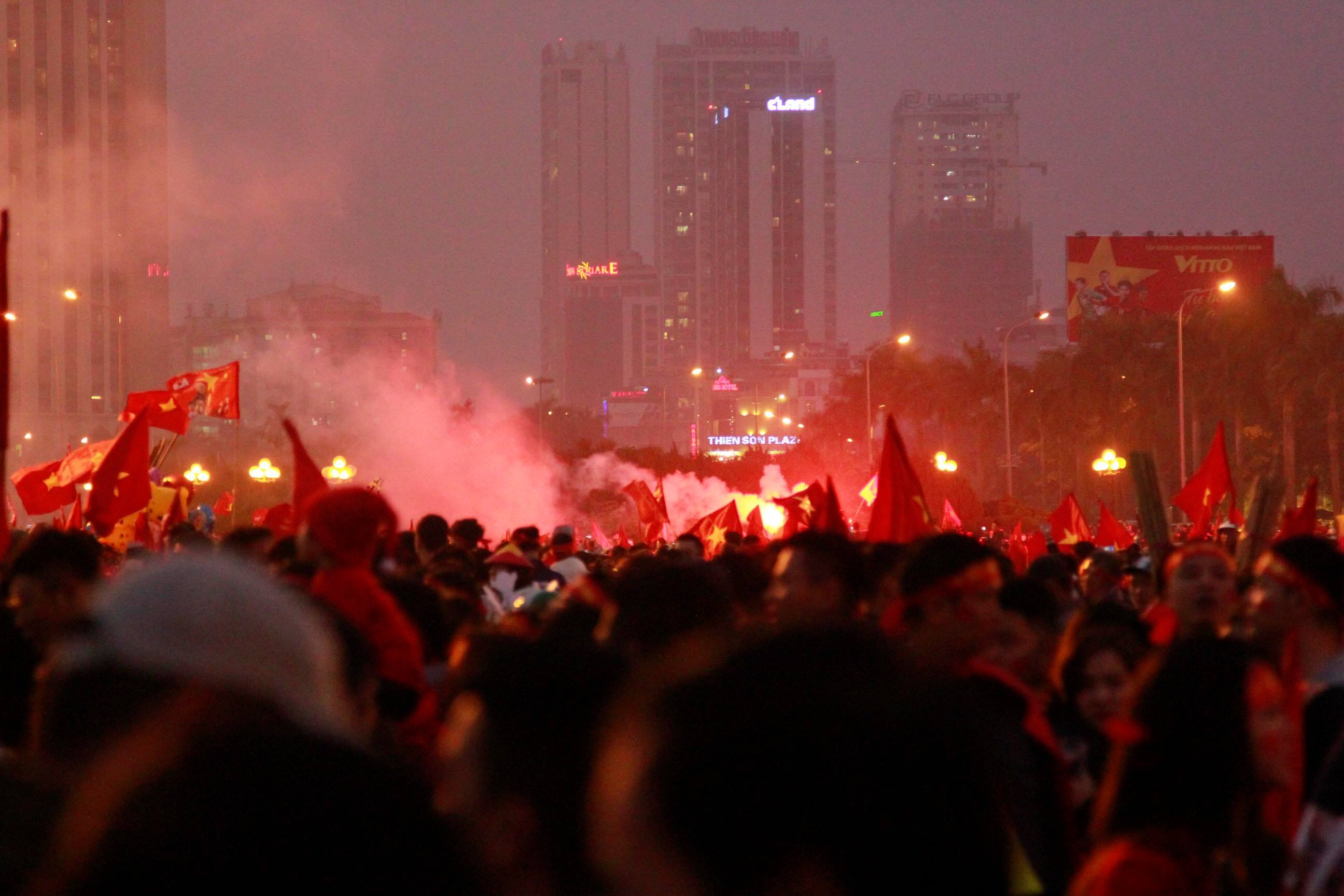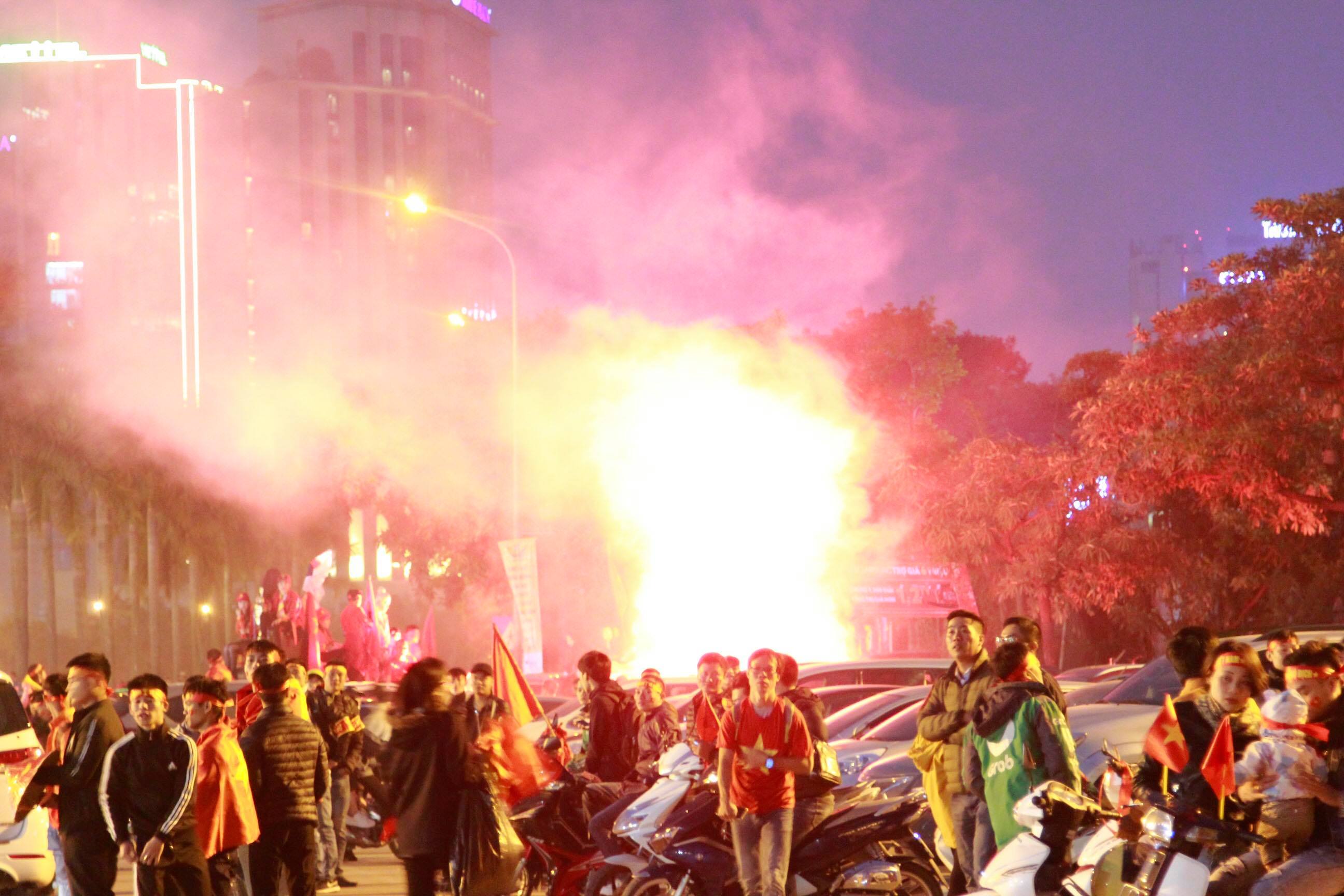 Cổ động viên Malaysia đốt pháo sáng rực một góc trời Hà Nội là những hình ảnh gây chú ý tối nay.