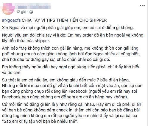 Đó là câu chuyện của một cô gái giấu tên đăng vào confession của một fanpage lớn trên MXH những ngày gần đây. Không chỉ bị người yêu phàn nàn vì tips thêm cho shipper., mà cô gái này còn ”mang tiếng” là ăn hàng, mặc dù phần ăn chỉ có 80k.