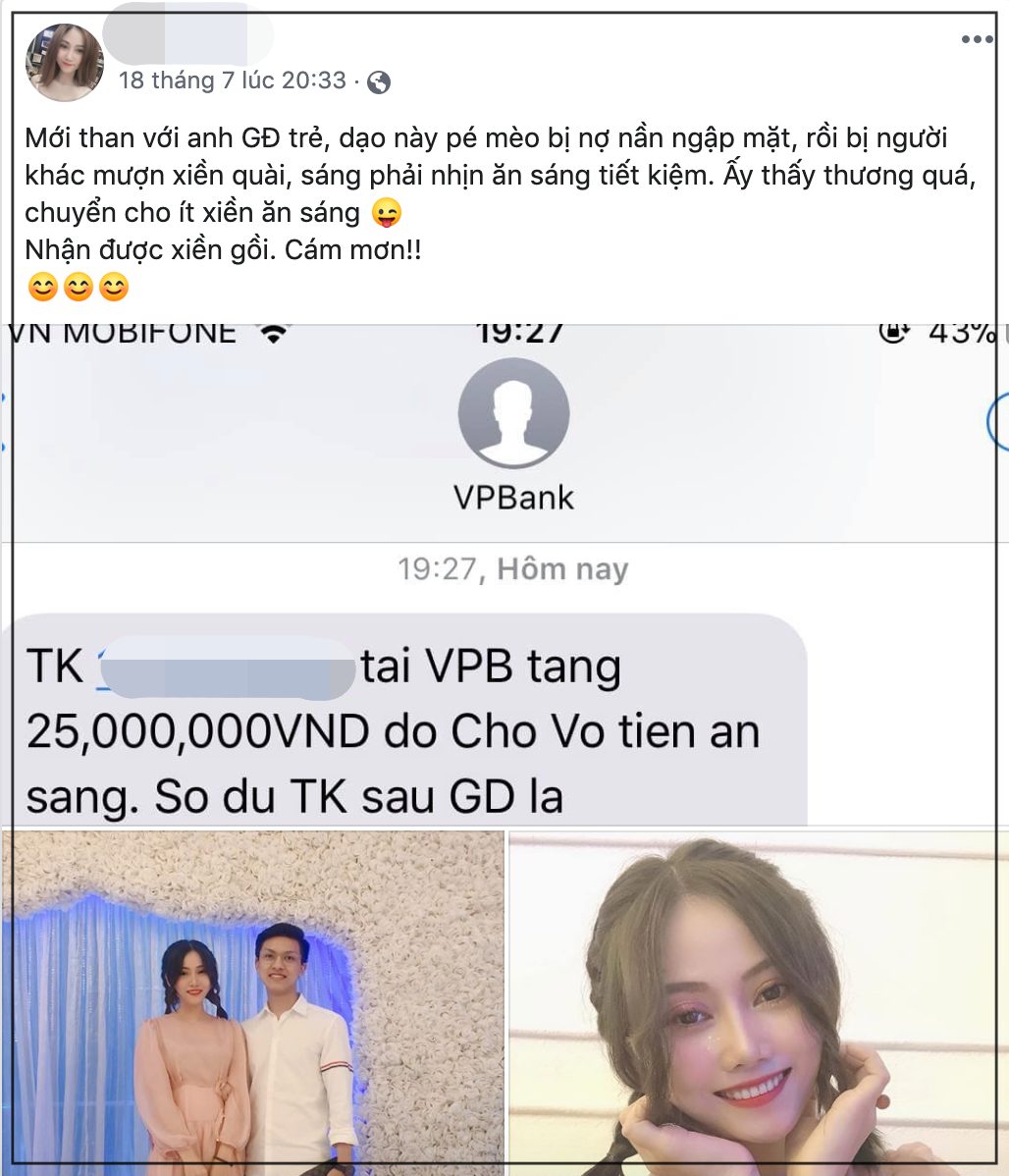 Theo đó, cô gái có nickname Mery Đam từng đăng một status than thở ”nợ nần ngập đầu” vì bị mọi người nhờ vả quá nhiều. Liền tức khắc, anh chàng người yêu đã ”bắn” thẳng 25 triệu vào tài khoản với nội dung ”Cho vợ tiền ăn sáng”. Khi Mery Đam khoe tin nhắn này lên trang cá nhân, đã nhận về sự ganh tỵ hết mức của các cô gái.