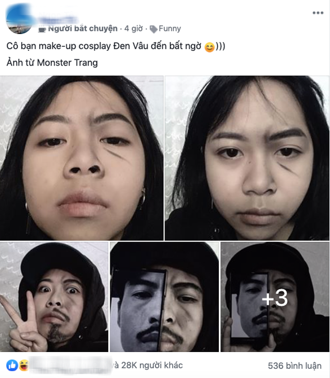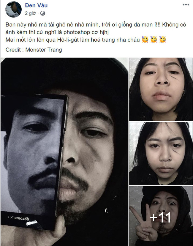 Cụ thể, cô gái có tên Monster Trang đăng tải quá trình hóa thân thành Đen Vâu bằng một loạt ảnh. Khuôn mặt của Trang khá bầu bĩnh, khác xa với sự góc cạnh của nam rapper, tuy nhiên, chỉ bằng một vài thao tác tô vẽ trên mặt, cô nàng đã lập tức “biến hình”.