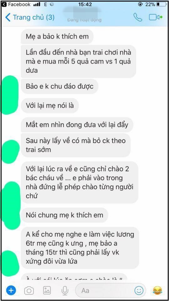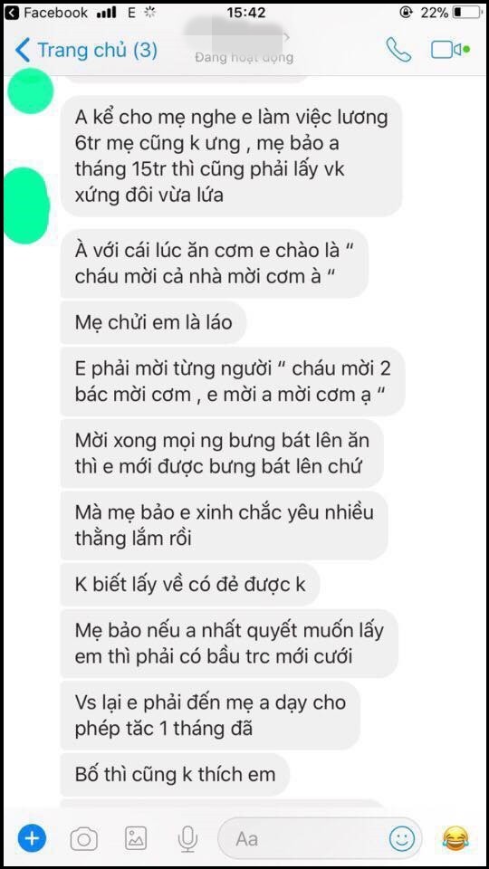 Nhưng chưa hết, chàng trai còn tuôn thêm một tràng dài với điệp khúc “mẹ anh bảo”. “Anh cũng kể cho mẹ nghe lương em 6 triệu mẹ cũng không ưng, mẹ bảo lương anh 15 triệu phải lấy người xứng đôi vừa lứa.”