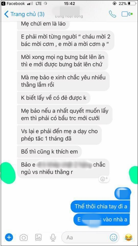 Cụ thể, theo những dòng tin nhắn được chụp lại, chàng trai bảo: “Mẹ anh không thích em đâu. Lần đầu đến nhà bạn trai chơi mà mua được 5 quả cam với một quả dưa. Mẹ bảo em không được chu đáo”.