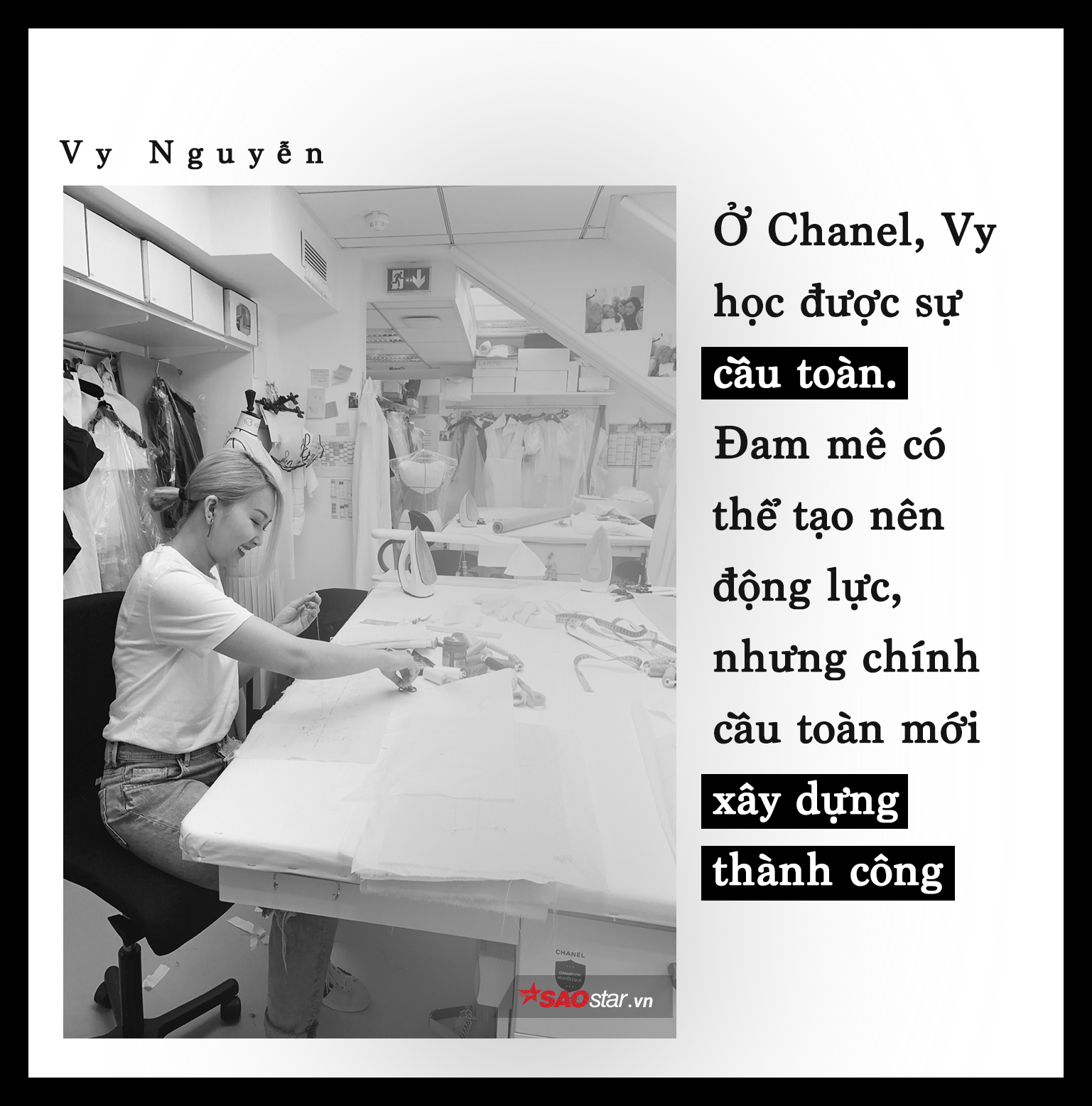Vy chia sẻ: “Ở Chanel, không chỉ một mẫu thiết kế mà mỗi nút áo, mỗi đường may mũi chỉ hay chỉ việc ủi mẫu thiết kế đều được thực hiện vô cùng tỉ mỉ và cẩn thận. Một đơn đặt hàng có thể được thực hiện từ một đến ba tháng, đòi hỏi công sức và sự chú tâm 100% của cả một tập thể”.