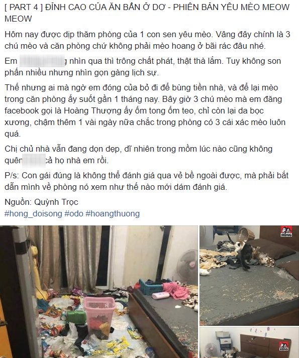 Theo đó, cô gái đến thuê nhà ngay lập tức được chủ nhà tin tưởng bởi gương mặt và vóc người gọn gàng, lịch sự. Tuy nhiên, sau một thời gian, cô gái đáng tin ngày nào đã “bùng” tiền nhà, bỏ đi không lời từ biệt. Đáng chú ý hơn nữa là căn phòng mà cô ở không khác nào một bãi rác, 3 con mèo mà cô nuôi nấng cũng được bỏ lại, ốm tong ốm teo, chỉ còn da bọc xương….