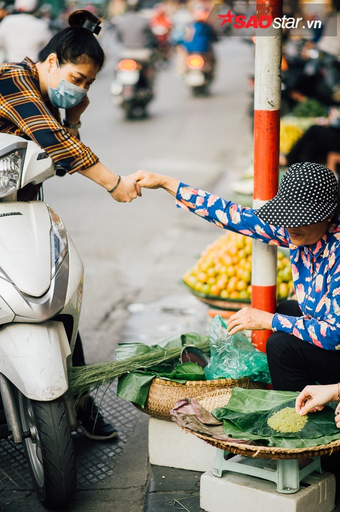 Họ tranh thủ mua một gói cốm tươi…