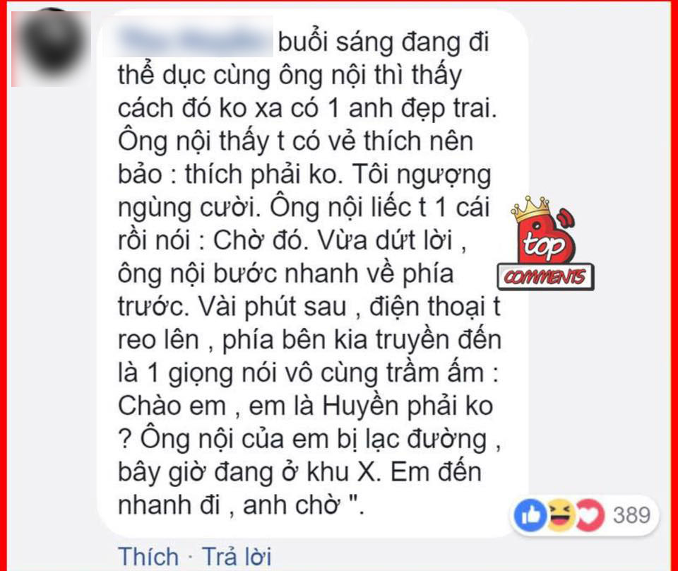 Cụ thể, dòng chia sẻ của bạn gái như sau: “Buổi sáng đi thể dục cùng ông nội thì thấy cách đó không xa có 1 anh đẹp trai. Ông nội thấy tớ có vẻ thích, nên bảo: Thích phải không? Tớ ngượng ngùng cười. Ông liếc 1 cái rồi nói, chờ đó. Dứt lời, ông nội bước nhanh về phía trước. Vài phút sau, điện thoại tớ reo lên, phía đầu dây bên kia truyền đến 1 giọng nói vô cùng trầm ấm: Chào em, em có phải Huyền không? Ông nội của em bị lạc đường, bây giờ đang ở khu X. Em đến nhanh đi, anh chờ”.