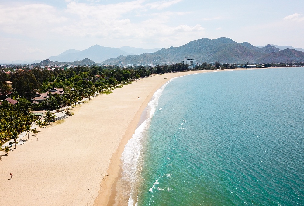 Thoai thoải chiều dài 10km, bãi biển Ninh Chữ sở hữu bờ cát phẳng lì, uốn lượn hình cánh cung, nối liền hai làng chài yên bình nơi hai đầu bãi biển.