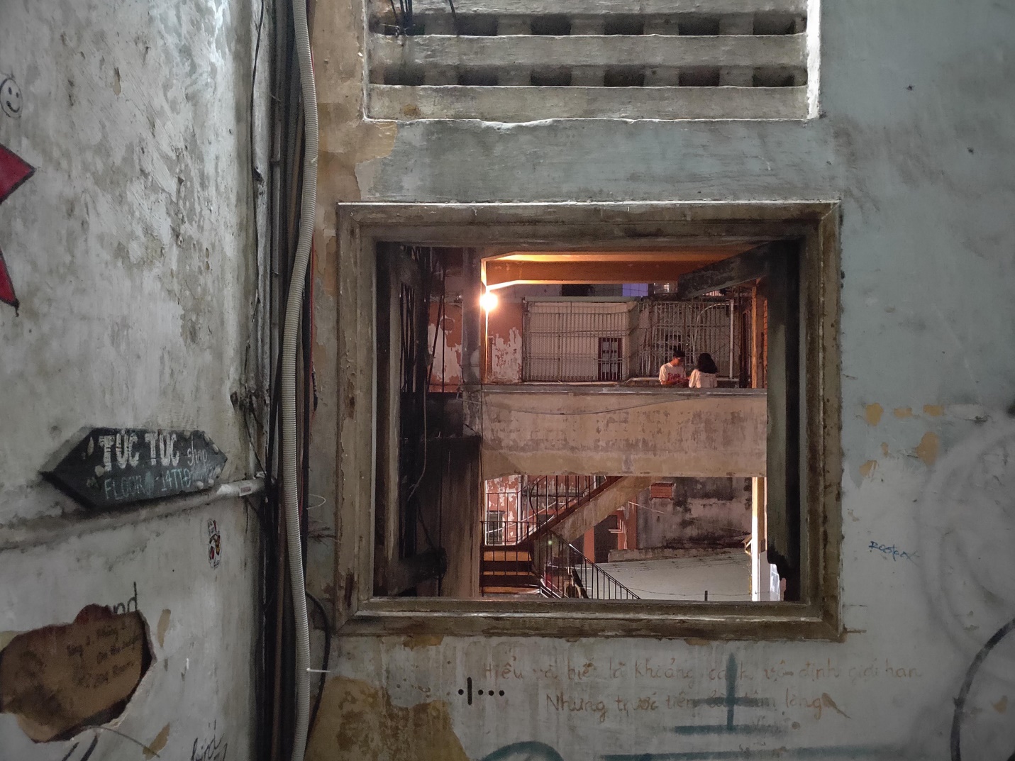 Không chỉ hiện lên với những khung hình lung linh đầy sôi động, có một Sài Gòn dịu dàng và lãng mạn hơn với những góc chung cư nhỏ; nơi hò hẹn quen thuộc của những đôi tình nhân qua góc nhìn của các bạn trẻ như Đỗ Diệu Sang và Nguyễn Đào. Chọn bối cảnh chụp ảnh là khu chung cư cũ trên đường Tôn Thất Đạm, Diệu Sang đã vô tình bắt gặp hình ảnh rất nên thơ này của đôi bạn trẻ. Qua ô cửa sổ lớn, trên những bậc cầu thang cùng dãy hành lang dài nơi chung cư cũ, khoảnh khắc hẹn hò của đôi bạn trẻ hiện lên đầy ấn tượng trong khung ảnh.