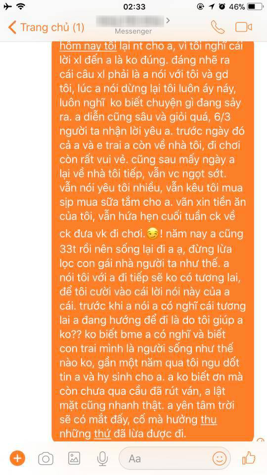 Ngày 6/3, người ta nhận lời yêu anh. Trước đó, anh cùng em trai vẫn đến nhà tôi chơi, sau mấy ngày vẫn vợ chồng ngọt xớt. Thậm chí, anh xin tiền tôi và hứa hẹn cuối tuần về đưa đi chơi. Năm nay, anh 33 tuổi rồi đừng lừa lọc con gái nhà người ta mãi thế. Anh nói yêu tiếp sẽ không có tương lai, trước khi nói anh có nghĩ tương lai anh đang hướng là tôi giúp anh không. Anh không biết ơn còn qua cầu rút ván“.