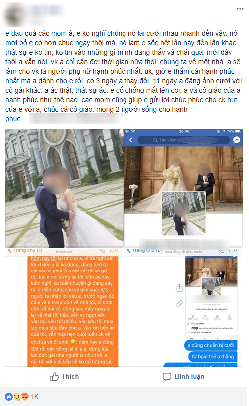 Bài viết được đăng tải trên một diễn đàn dành cho phụ nữ, tài khoản S.S đến từ Hà Nội viết: “Mình đau lòng quá mọi người à! Mình không nghĩ chúng nó cưới nhau nhanh đến vậy. Hắn mới bỏ mình hơn chục ngày mà khiến mình sốc hết lần này đến lần khác. Thật sự mình không tin vào những gì bản thân đang thấy và trải qua.