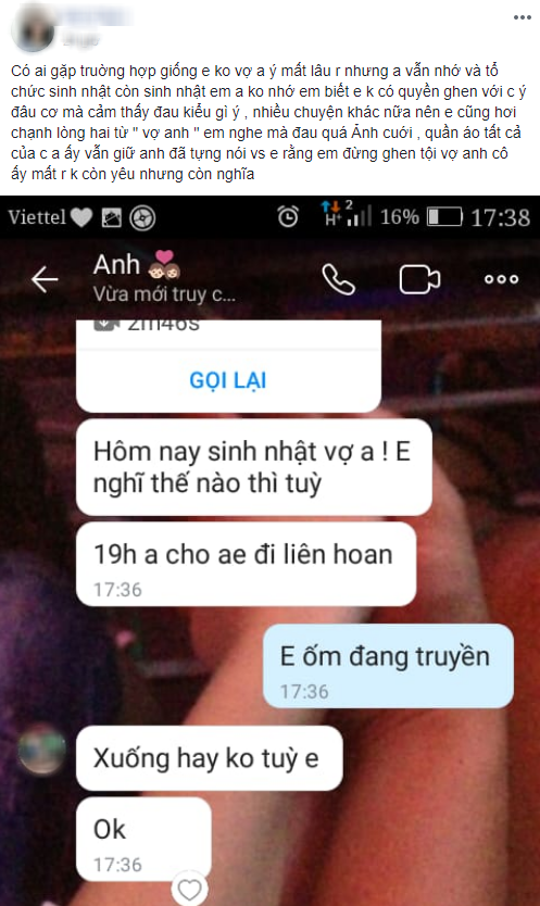 Cô gái viết: “Có ai gặp truờng hợp giống em không? Vợ anh ý mất lâu rồi nhưng anh vẫn nhớ và tổ chức sinh nhật, còn sinh nhật em anh không nhớ.