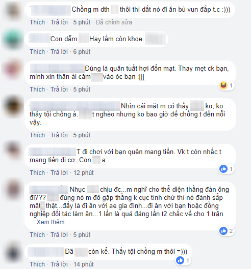 “Nhục không tả được, bạn có nghĩ phải giữ thể diện cho chồng không? Đúng là bạn đỏ khi gặp được chồng không cực tính. Đi ăn với anh em gia đình, đồng nghiệp hoặc đối tác làm ăn, lần 1 là quá đáng chắc lần 2 ly hôn luôn. Chồng mình chứ chồng ai mà để người ta chê cười, nếu không muốn nó có quỹ đen thì đừng sống “lỗi” như thế”, tài khoản Đ.R.T bức xúc bình luận.