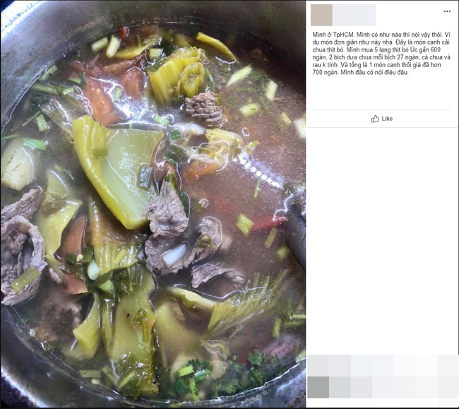 Hay như món canh cải chua thịt bò cũng tiêu tốn hơn 650 nghìn đồng bao gồm 5 lạng bò Úc 600k và 2 bịch cải chua (mỗi bịch 27k), chưa tính cà chua và rau thơm.