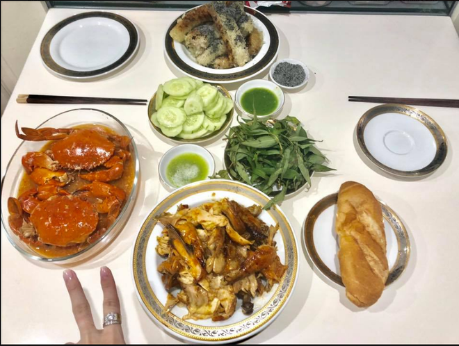 Chị Q.T.D thì cho rằng nhưng mâm cơm này phải 3 - 4 người ăn mới hết. “Nhà mình 3 người mà hôm nào nấu 1 nồi canh, 2 món mặn cũng đều thừa không ăn hết. Mom nấu nhiều như vậy chắc gia đình bình thường phải 4 người ăn mới hết. Bây giờ một ngày cầm 80k ra chợ thiệt sự run tay cho 2 bữa mặn, canh, xào. Thịt heo nay 120k/kg, bò 260k/kg, gà 90k/kg, cá diêu hồng trung bình 40-50k/con, cua đồng, tôm, mực giao động 20-30/lạng. Rau muống, lang, củ, cà chua cũng phải 20k/ ngày. Chưa kể gia vị, gạo nữa”.