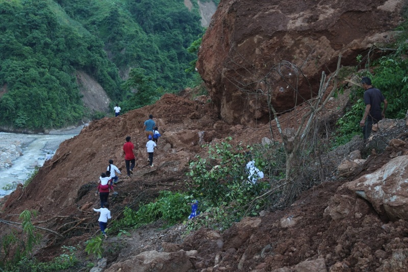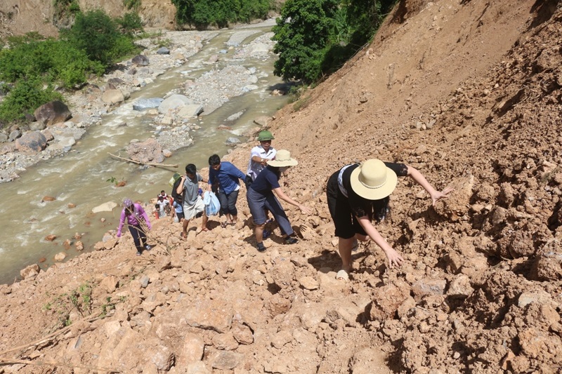 Có những nơi lũ cuốn hết đường, một bên là vách núi, phía dưới là dòng suối chảy mạnh.