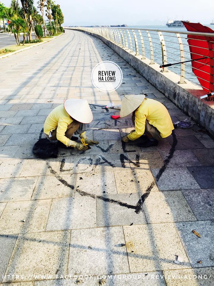Các công nhân môi trường đang cố gắng xóa chữ (Ảnh: Review Hạ Long)