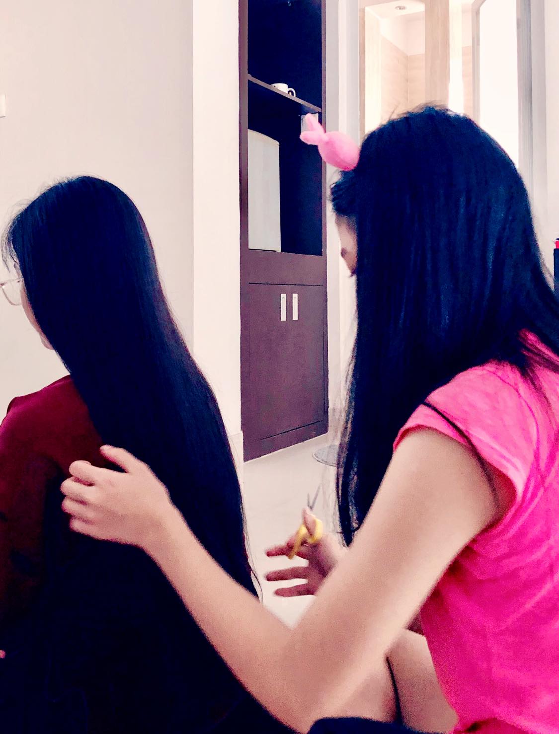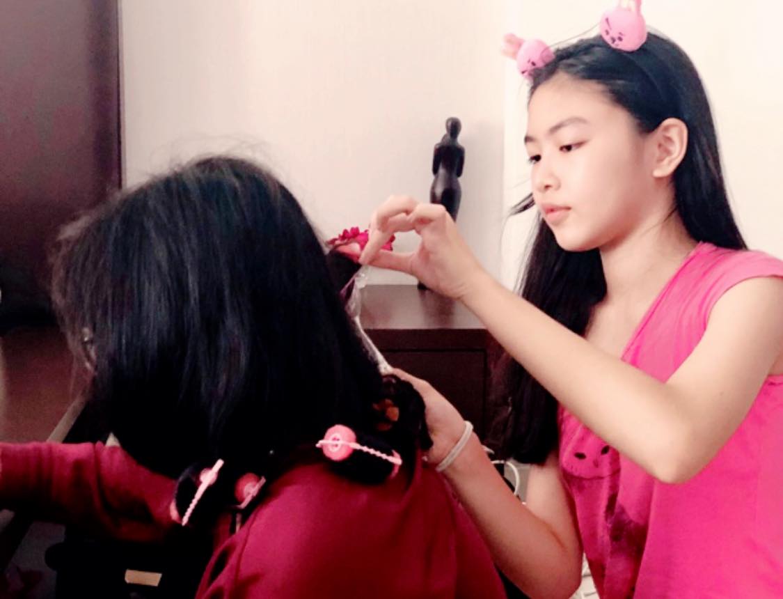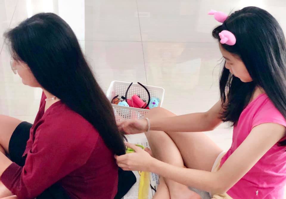 Mới đây, khoảnh khắc Lọ Lem đang chăm chú làm tóc cho bé Bí Ngô - con gái của nghệ sĩ Hồng Vân đã khiến nhiều người thích thú.