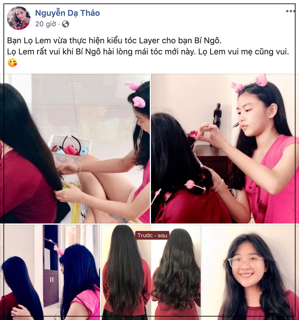Trên facebook của doanh nhân Dạ Thảo - vợ MC Quyền Linh đã đăng tải hình ảnh Lọ Lem cùng dòng chia sẻ: “Bạn Lọ Lem vừa thực hiện kiểu tóc Layer cho bạn Bí Ngô. Lọ Lem rất vui khi Bí Ngô hài lòng với mái tóc mới này. Lọ Lem vui mẹ cũng vui”. Bài viết nhận được rất nhiều lượt yêu thích và bình luận của cư dân mạng. Nhìn thành quả của Lọ Lem sau một hồi chăm chỉ làm, ai cũng phải trầm trồ khen ngợi sự khéo tay cô bé.