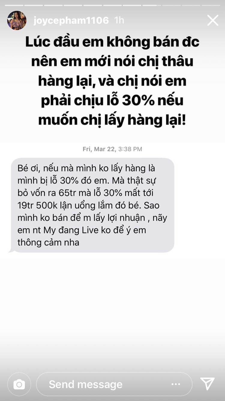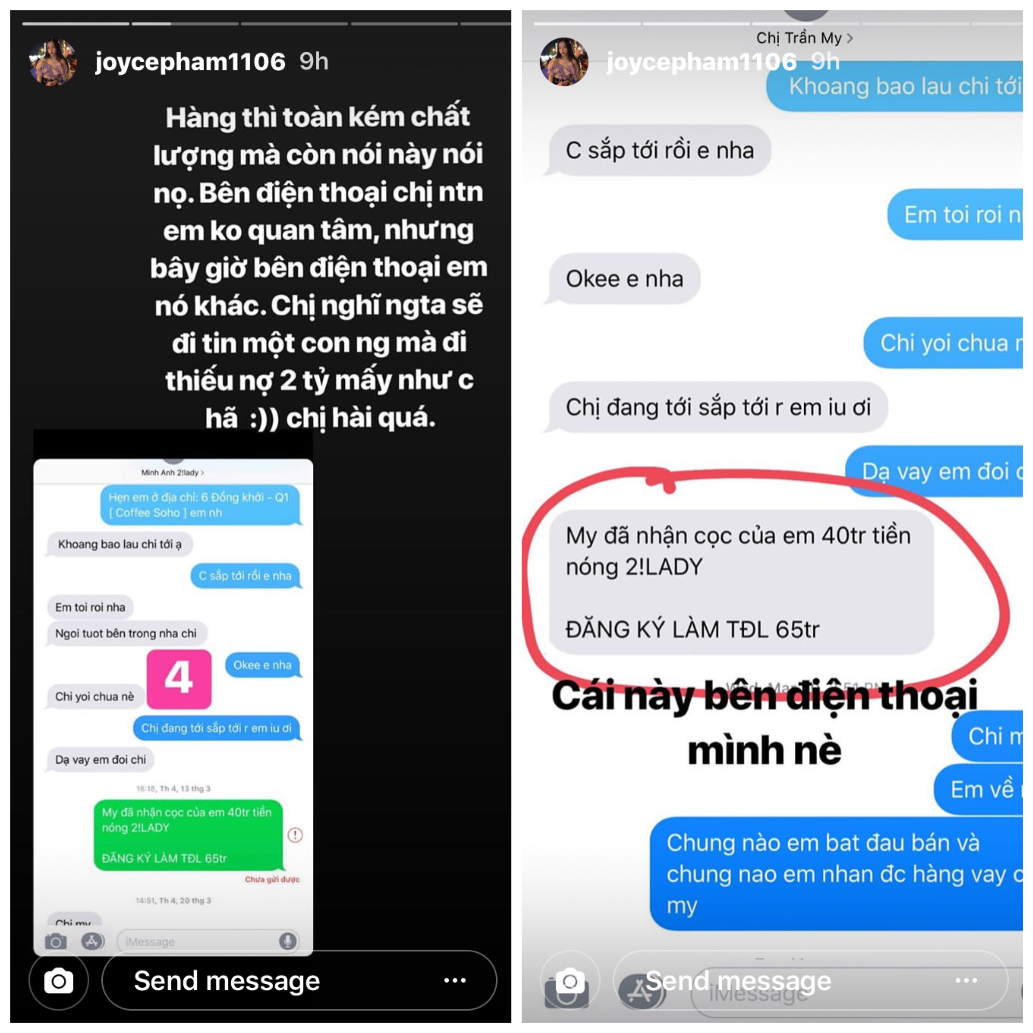 Nhưng ngay lập tức Minh Anh đăng story đáp trả Trần My, tung các tin nhắn cho biết Trần My từng chấp nhận mức chịu lỗ 30%, tức Minh Anh sẽ được lấy lại 70% tiền hàng khi trả hàng. Nhưng cô đòi mãi không được.