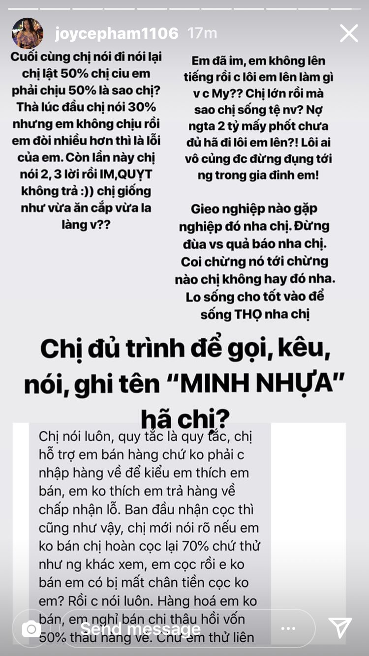 “Mặc dù em con gái Minh Nhựa, nhà em như thế nào, gia cảnh em như thế nào nhưng em biết tự đi kiếm tiền. Chưa bao giờ lừa gạt hay thiếu tiền người khác nha chị My. Chị ăn ở sao mà chị đi lừa gạt người ta 2 tỷ mấy vậy. Rồi ăn vạ không được quay qua bóc phốt con Minh Nhựa?” - Joyce Phạm bày tỏ sự tức giận trên Instagram cá nhân.