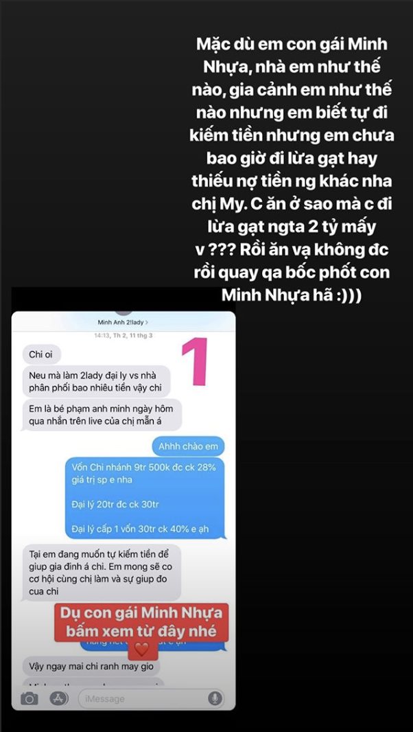 Drama cụ thể là, Minh Anh liên lạc để xin làm đại lý cho thương hiệu mỹ phẩm của Trần My và cả hai nhắn tin qua lại trao đổi. Nhưng được nửa đường thì bỗng phía Trần My đùng đùng đăng đàn tin nhắn và bóc phốt nàng Rich kid. Nhưng Minh Anh cũng không vừa khi tố Trần My lừa đảo, hàng kém chất lượng với lời lẽ cực gắt: Chị lấy được của em 65 triệu thì kiếp này hoặc kiếp sau chị trả em gấp 2 gấp 3 lần… chị sống tệ sẽ có quả báo”.