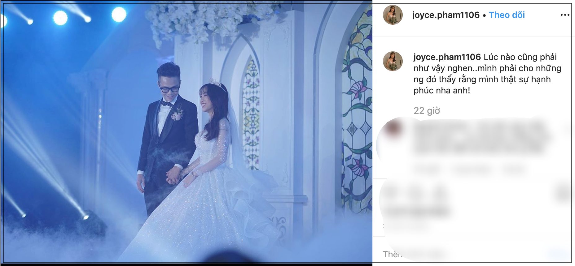 Bên cạnh đó, cô cũng đăng một tấm ảnh hạnh phúc với chồng kèm caption có tính chất ”dằn mặt”: ”Lúc nào cũng phải như vậy nghen.. Mình phải cho những người đó thấy rằng mình thật sự hạnh phúc nha anh!”. Bài viết đã khiến nhiều người phải gửi lời khuyên đến cô dâu là hạnh phúc là chuyện riêng của hai người, đừng cố tỏ ra hạnh phúc chỉ để cho người khác thấy.