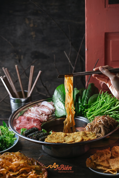 Ta hay nhắc đến phở Hà Nội, bánh canh Đà Nẵng, cơm gà Hội An, cơm hến Huế hay hủ tiếu Sài Gòn. Và quả là thiếu sót lớn nếu ta không nhắc đến Bánh đa đỏ Hải Phòng - linh hồn của ẩm thực xứ này. Để có được từng sợi bánh đa dẻo dai, vàng óng, thơm đượm hương lúa gạo là trải qua biết bao công đoạn: ngâm gạo, xay bột, tráng bánh, phơi bánh trên từng phên tre ngoài trời và cuối cùng là cắt bánh. Thưởng thức bánh đa cua, bánh đa chảo nóng hay các lẩu các loại ngay tại không gian An Biên Lò Sũ, cảm giác như đang ngồi giữa làng nghề bánh đa đỏ truyền thống và tận mắt nhìn ngắm nghệ nhân chế biến. Một cảm giác thật chân thực, sống động.
