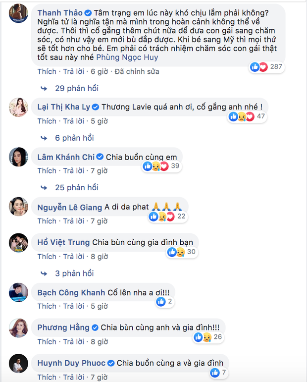 Ngay khi biết được động thái này của Phùng Ngọc Huy, nhiều nghệ sĩ Việt như ca sĩ Thanh Thảo, diễn viên Kha Ly, nghệ sĩ Lê Giang hay Lâm Khánh Chi,… đã vào an ủi và động viên anh sớm vượt qua nỗi đau này.