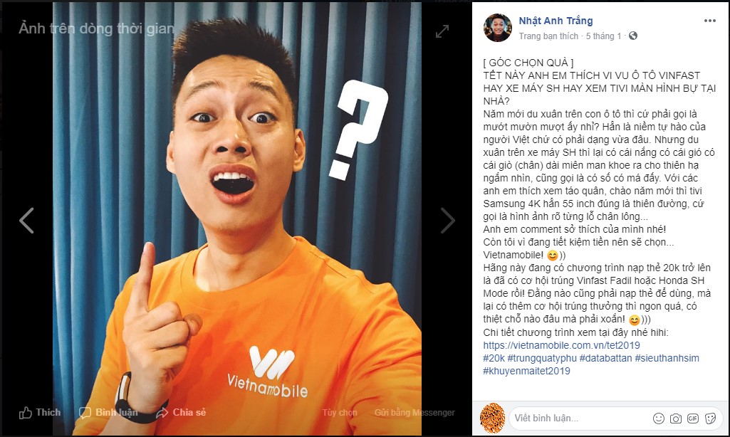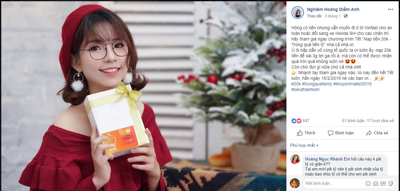 Mấy tuần qua, dân mạng đang rần rần vui sướng với việc có thể được ăn Tết siêu lớn quà tiền tỷ như TV Samsung 4K, Điện thoại Samsung A7, hay trúng cả xe SH, siêu xe Vinfast để du xuân. Nhiều bạn trẻ đã nhỏ to rủ rê bạn bè cùng tham gia để lỡ bạn mình trúng siêu xe thì mình cũng được hưởng ké. Không tin ư, cùng dạo 1 vòng facebook xem nào!