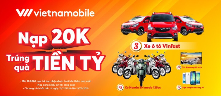Từ 15/12/2018 đến 15/2/2019, Vietnamobile giới thiệu chương trình khuyến mãi Tết “Nạp 20k - Trúng quà tiền tỷ” dành cho các khách hàng đang sử dụng dịch vụ. Theo đó, với mỗi lần nạp thẻ có mệnh giá từ 20.000 VNĐ trở lên khách hàng sẽ nhận được các mã dự thưởng để có cơ hội trúng các giải: 3 xe ô tô VinFast Fadil trị giá 466.000.000 VNĐ, 23 giải nhất xe máy SH Mode 125CC, 25 giải nhì Smart Tivi Samsung 4K 55 inch trị giá 20.000.000 VNĐ và 25 điện thoại Samsung Galaxy A7 trị giá 8.990.000 VNĐ.