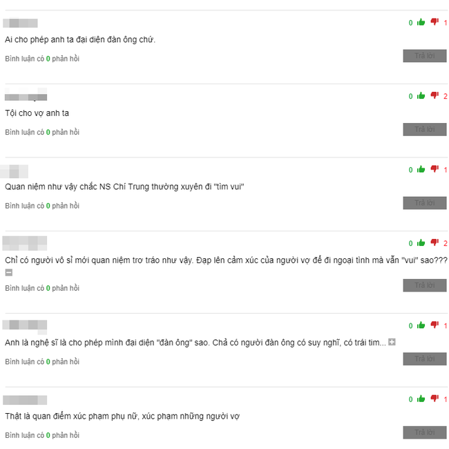 Theo đó, vào năm 2017, trong buổi tọa đàm về “Đàn ông là số 1 hay số 0?” do báo Thể thao Văn hóa tổ chức, NSƯT Chí Trung đã cho rằng: “Đàn ông rất hay ngoại tình, trừ những người quá sa đọa thì tôi không nói, nhưng phần đông đều có cái tính này, nhưng cũng chỉ là… cho vui thôi, vì đây là tính năng của giống đực vì trong tự nhiên, con đực luôn muốn chiếm hữu và chinh phạt. Đàn ông nói chung ba lăng nhăng nhưng không bỏ vợ. Phụ nữ rất ít ba lăng nhăng, họ rất yêu chồng yêu con, nhưng khi họ đã ngoại tình, đã yêu một người nào đó thì bước qua tất cả, bước qua mặt chồng, xác con đi luôn”.