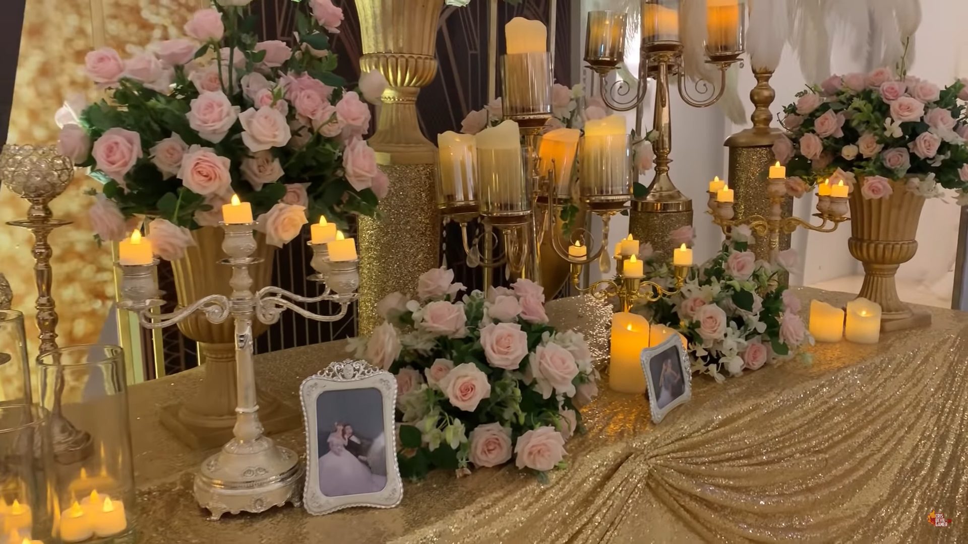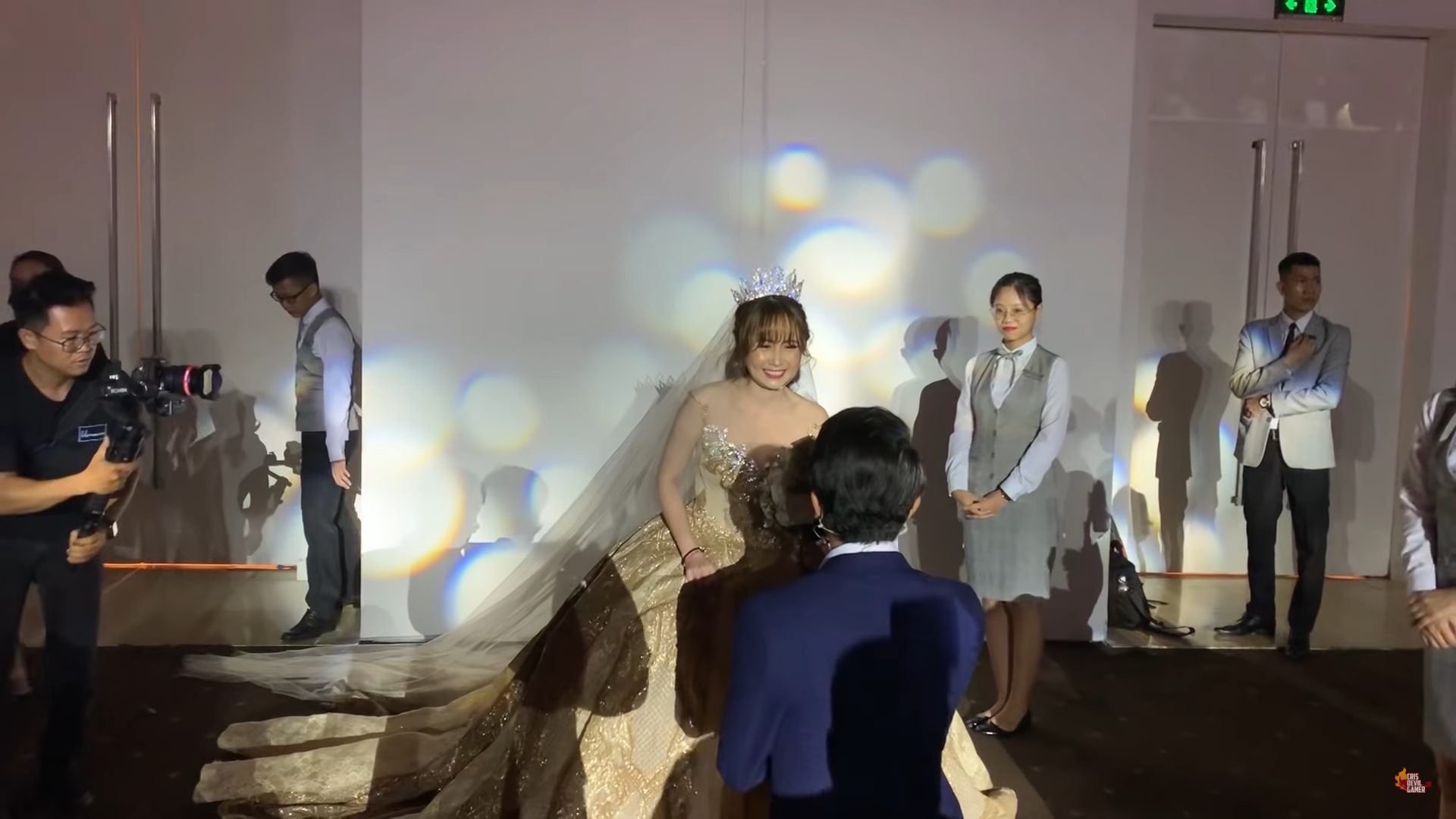 “Đây là bàn lễ tân trang trí bằng một màu vàng và bằng vàng luôn nhưng bằng vàng giả vì vàng thiệt thì không có tiền mua”, Cris Phan lầy lội chia sẻ trong vlog mới.
