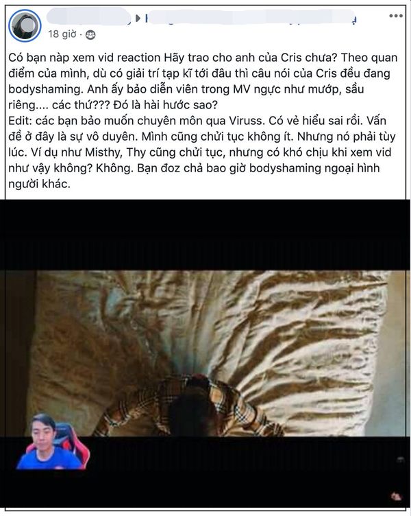 Người này viết: ”Có bạn nào xem video reaction Hãy trao cho anh của Cris chưa? Theo quan điểm của mình, dù có giải trí tạp kĩ tới đâu thì câu nói của Cris đều đang bodyshaming. Anh ấy bảo diễn viên trong MV ngực như mướp, sầu riêng…. các thứ??? Đó là hài hước sao?