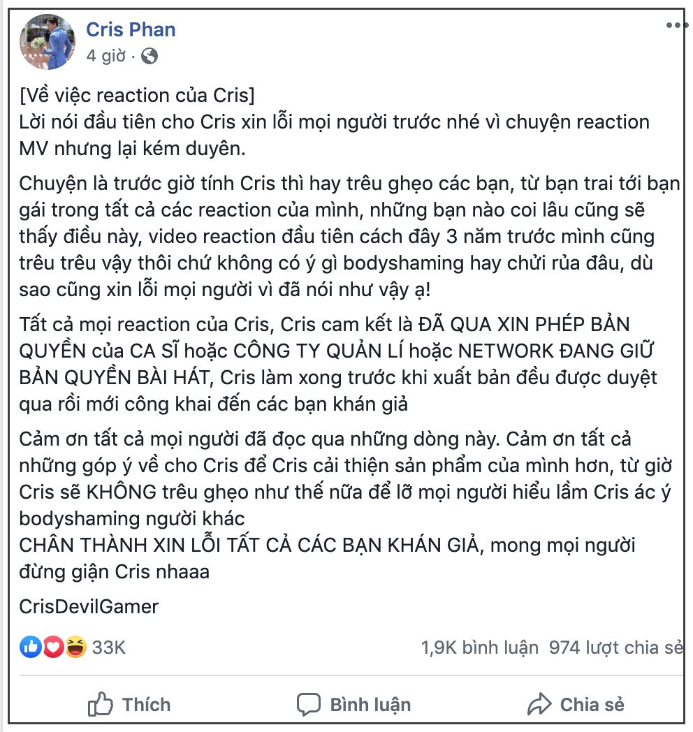 Trước làn sóng trái chiều này, mới đây, Cris Phan đã lên tiếng xin lỗi trên trang cá nhân. Anh viết: