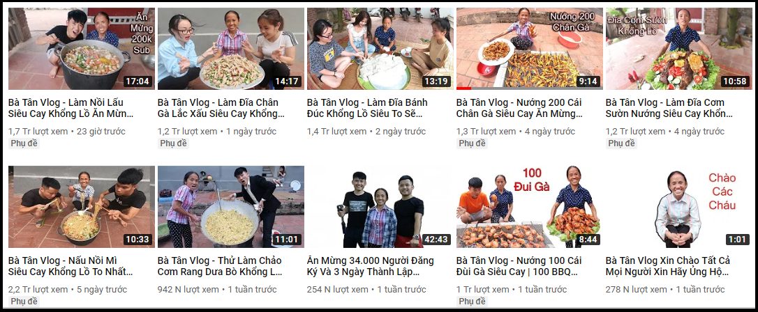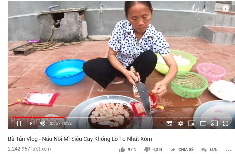 Hình ảnh người phụ nữ đã qua tuổi ngũ tuần trong các video hướng dẫn nấu ăn đã làm “dậy sóng” cộng đồng mạng. Không chỉ “Nồi mỳ siêu cay khổng lồ to nhất xóm“, người phụ nữ này còn chủ nhân gây sốt với Vlog “Nồi lẩu siêu cay khổng lồ“, “Cơm sườn nướng siêu cay khổng lồ“,… đạt trên 1 triệu view.