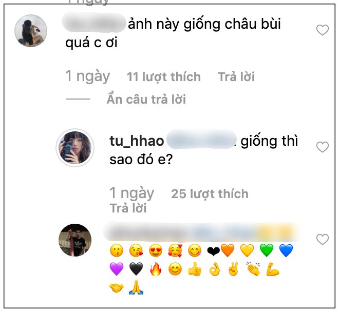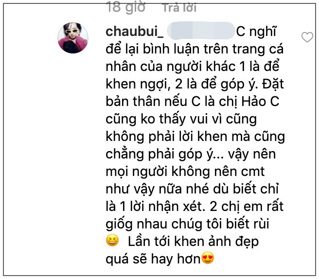 Sau đó, Châu Bùi cũng bất ngờ xuất hiện và làm dịu không khí căng thẳng này bởi một bình luận khá khéo léo. Cô viết: ”Châu nghĩ để lại bình luận trên trang cá nhân của người khác 1 là để khen ngợi, 2 là để góp ý. Đặt bản thân nếu Châu là chị Hảo Châu cũng không thấy vui vì cũng không phải lời khen mà cũng chẳng phải góp ý… Vậy nên mọi người không nên cmt như vậy nữa nhé, dù biết chỉ là 1 lời nhận xét. 2 chị em rất giống nhau chúg tôi biết rồi. Lần tới khen ảnh đẹp quá sẽ hay hơn”