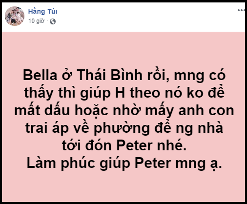 Nhận được tin, Hằng Túi - người đã từng dang rộng vòng tay bảo bọc cho mẹ con Bella nhưng bất thành - đã đăng một status với nội dung: ”Bella ở Thái Bình rồi, mọi người có thấy thì giúp Hằng theo nó không để mất dấu, hoặc nhờ mấy anh con trai áp về phường để người nhà tới đón Peter nhé. Làm phúc giúp Peter mọi người ạ”. Có thể thấy, dù xảy ra chuyện gì đi nữa, thì mối quan tâm lớn nhất của Hằng Túi vẫn là tình trạng của bé Peter.