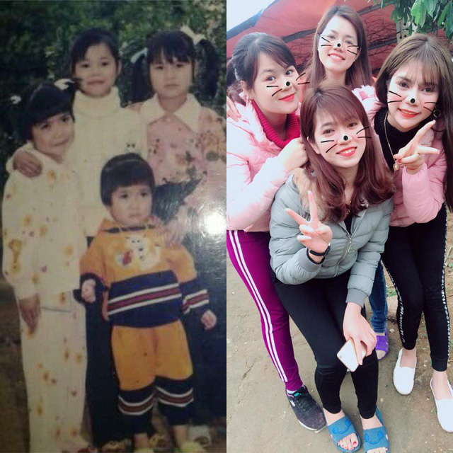 “Từ trái qua phải áo trắng là Nguyễn Thị Thơm (sinh năm 1994), em con nhà cậu ruột mình, bên cạnh là Trần Thị Đào (sinh năm 1991) con nhà bác mình, còn mình áo sọc đỏ, áo đen Đỗ Thị Hiền (sinh năm 1994) là hai chị em ruột. Năm 1998 tụi mình chụp bức ảnh vào ngày tụ họp giỗ bà ngoại và đến 2018 năm nay cũng lại chụp đúng vào ngày giỗ bà ngoại. 20 năm trước chị em đã được ở bên nhau nên giữ gìn để 20 năm sau có tấm hình chụp chung làm kỷ niệm”. Oanh viết.