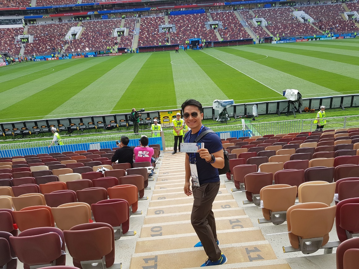 Check-in tại sân sân vận động Luzhniki cùng các cô gái Nga xinh đẹp, trên tay Hoàng Bách là chiếc vé FIFA World Cup quý giá do Visa trao tặng.