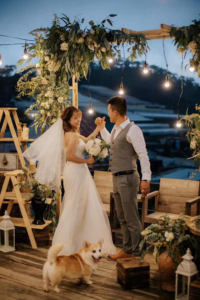 Hôn lễ được thực hiện với tông xanh trắng chủ đạo do đích thân chú rể cùng các bạn của mình thực hiện. Trí chia sẻ: “Mình đã chuẩn bị rất kỹ và tổ chức đúng ngày sinh nhật của vợ. Những tưởng mọi thứ sẽ thuận lợi và như trong tưởng tượng thì đúng lúc thời tiết không cho phép - hôm đó, bão vô sớm. Mình rất buồn và thương Trâm, váy cưới màu trắng lấm lem thành màu nâu luôn (cười). Chính vì vậy mà hình ảnh về “các con” cũng hạn chế”.
