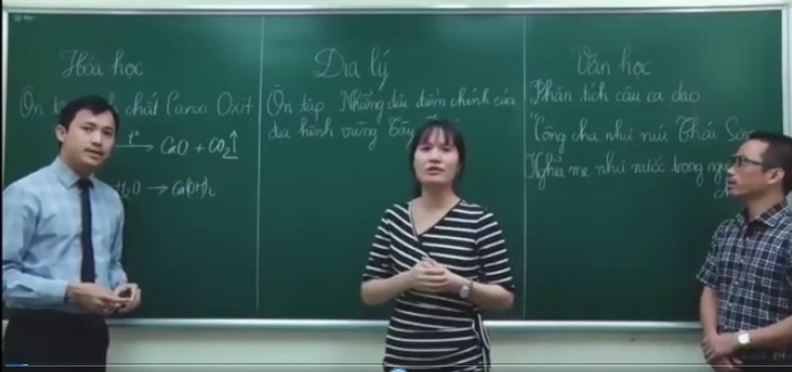 Trong clip, 3 giáo viên chia bảng thành 3 phần. Trong khi thầy Hóa dạy ôn tập tính chất của Canxi Oxit thì cô giáo Địa lý giảng về “Những đặc điểm chính của địa hình Tây Bắc”, còn thầy giáo Văn lại giúp học sinh phân tích câu ca dao “Công cha như núi Thái Sơn/ Nghĩa mẹ như nước trong nguồn chảy ra”. Ba thầy cô đã phối hợp logic và chuyển tiếp linh hoạt từ môn nọ sang môn kia.